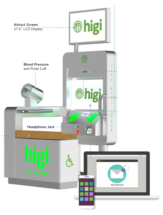 Higi stations measure blood pressure, pulse, weight, BMI, and offer risk assessments for diabetes, heart disease, and stroke.